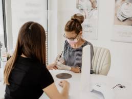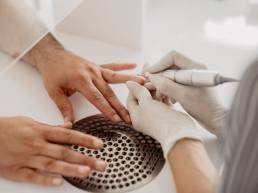 Die Nägel werden in Form gefeilt, überschüssige Nagelhaut entfernt, die Nagelplatte geglättet und poliert.